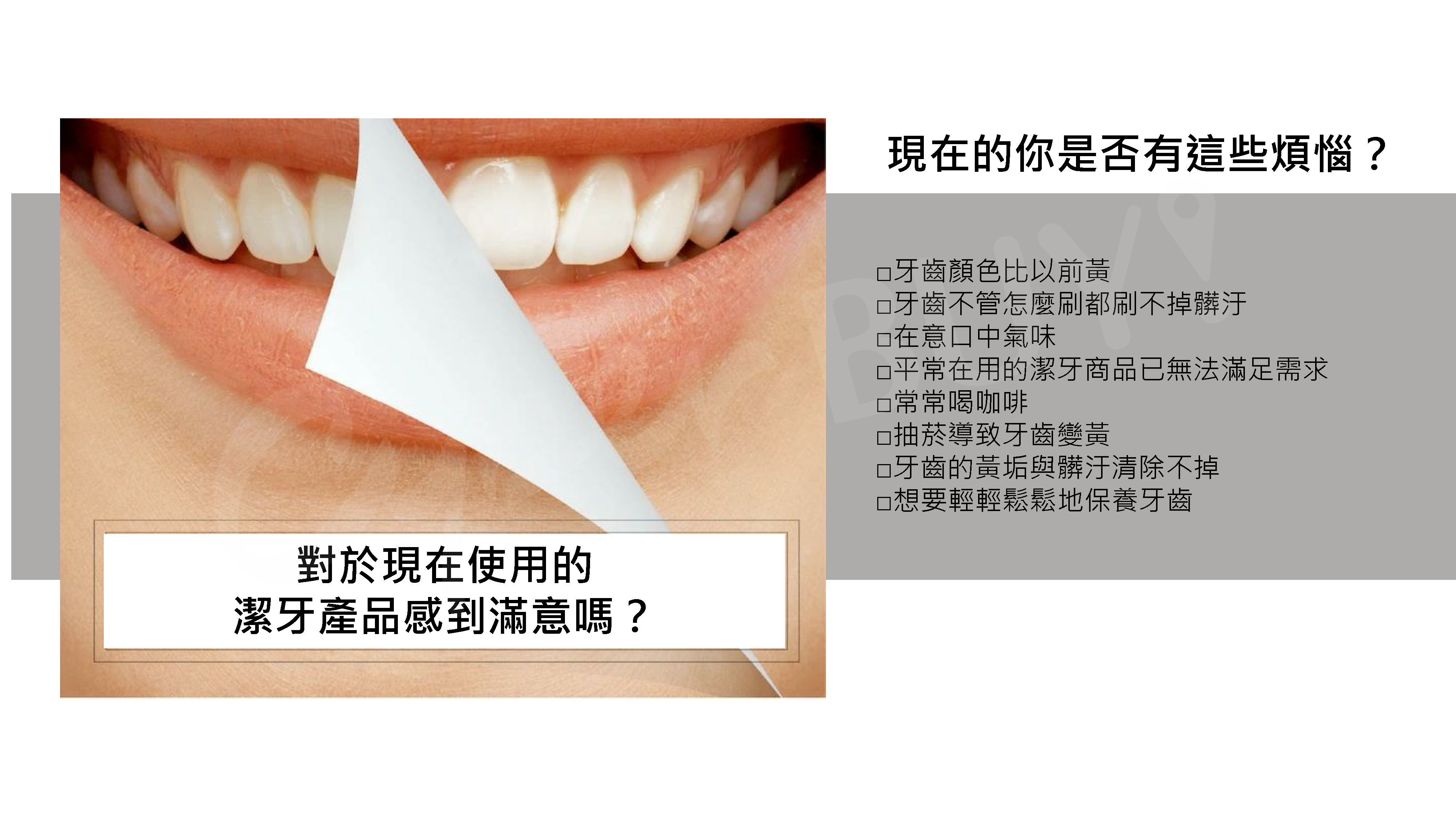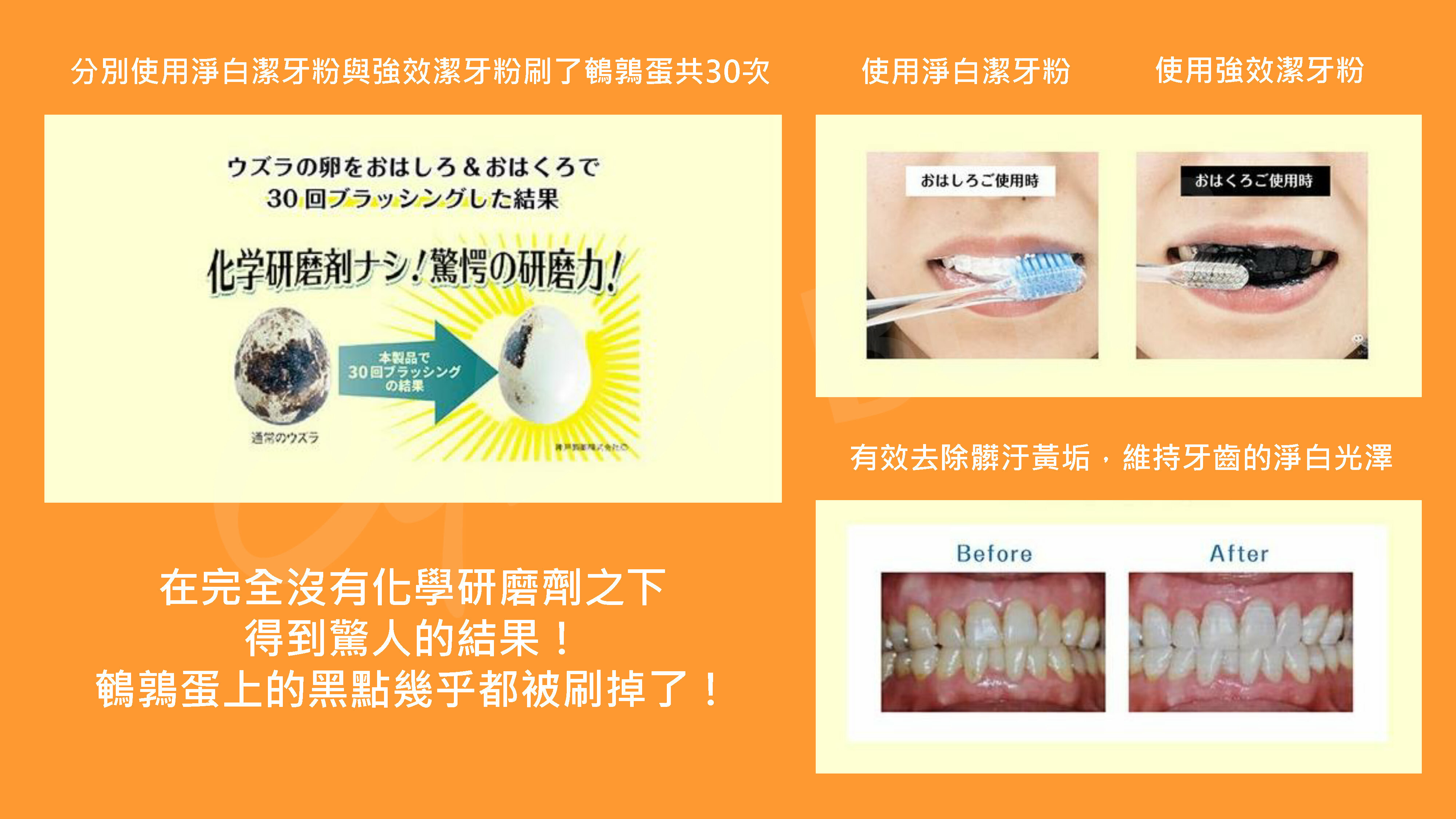 ●淨白潔牙粉主要針對在意牙齒黃垢與髒污的人所開發