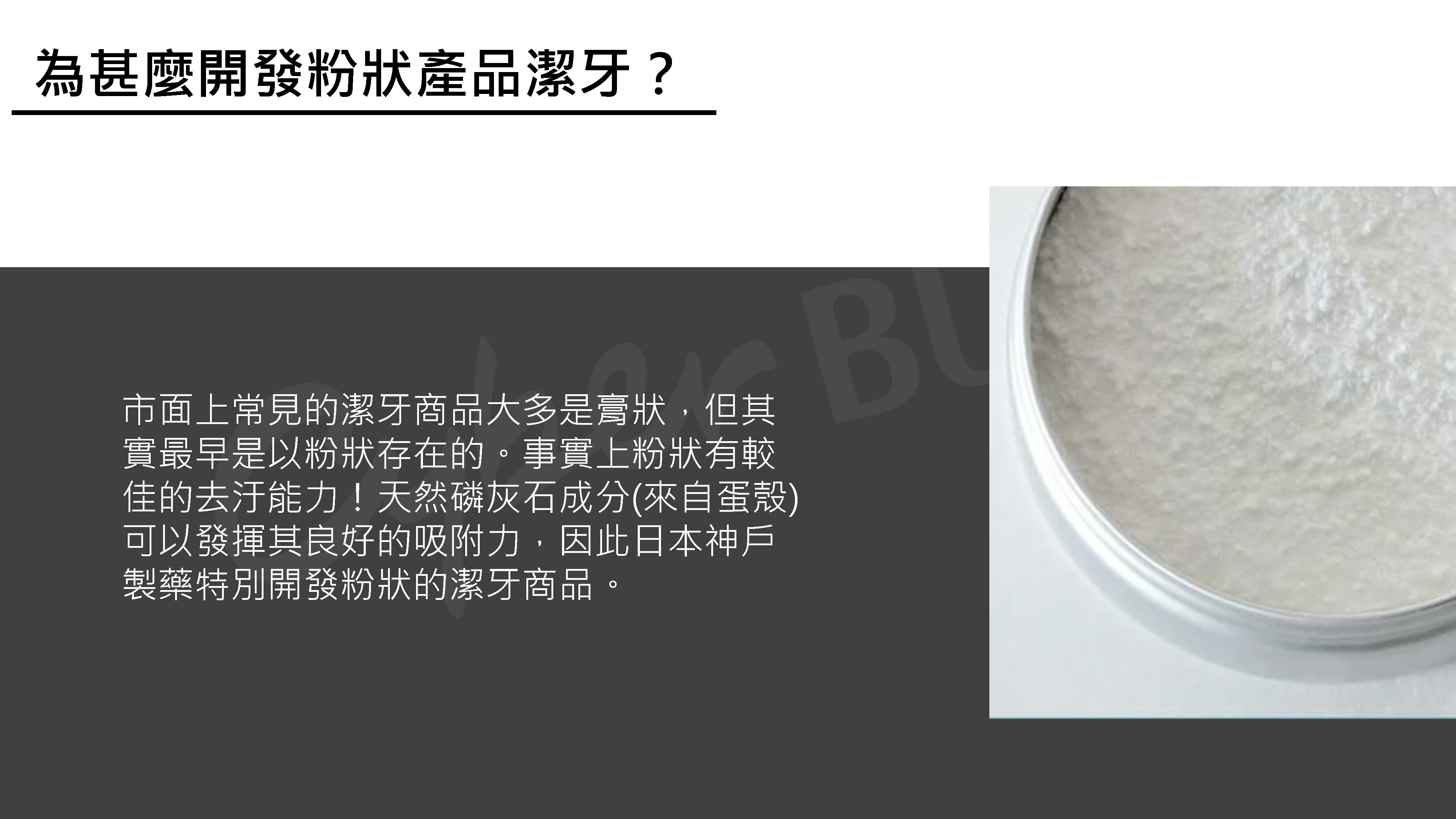 ●開發初衷是考量潔牙粉相較膏狀產品,具有較佳的去污能力