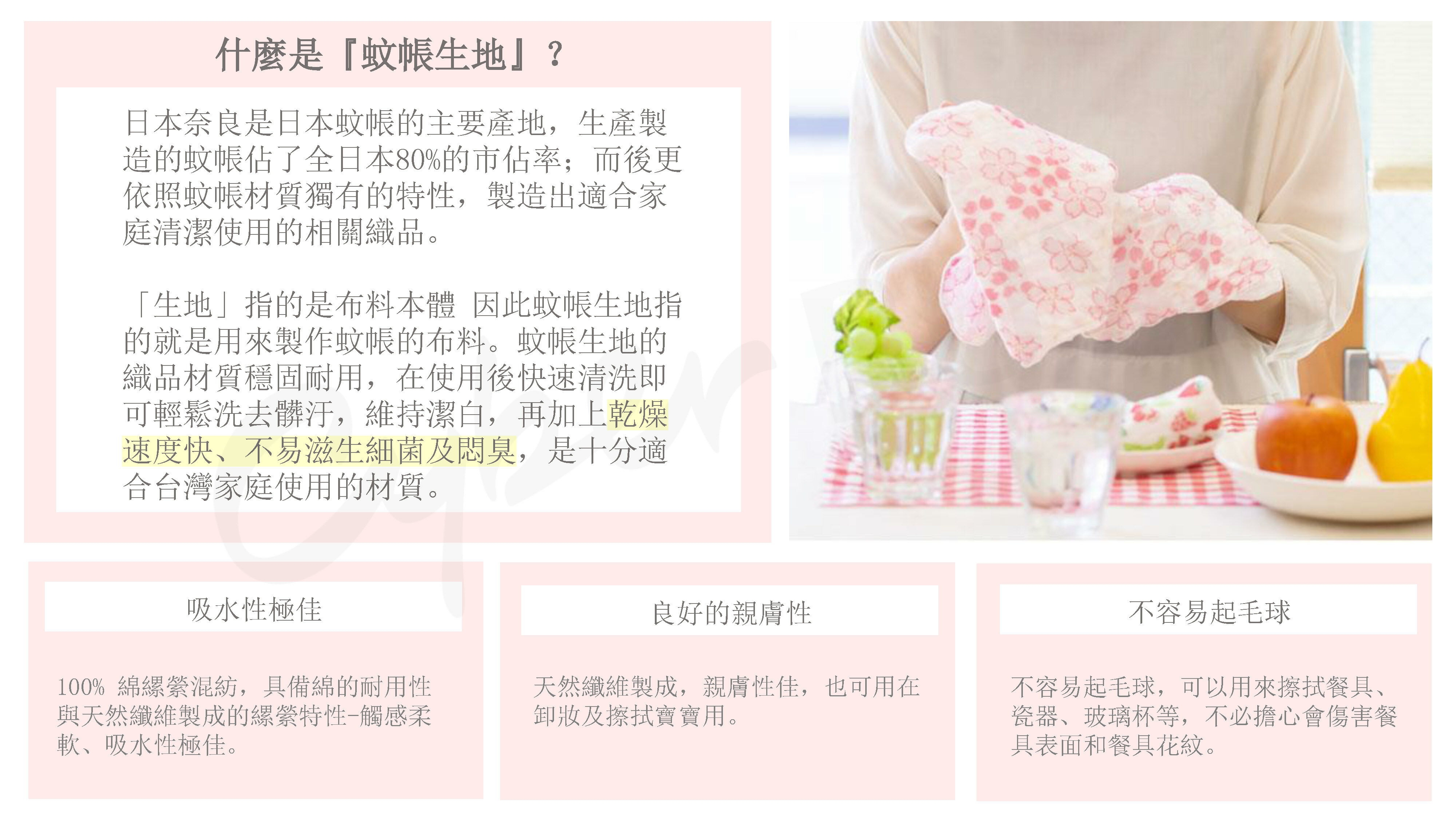 ●使用日本知名奈良製蚊帳材質,比一般家事布材質更強韌、更耐用