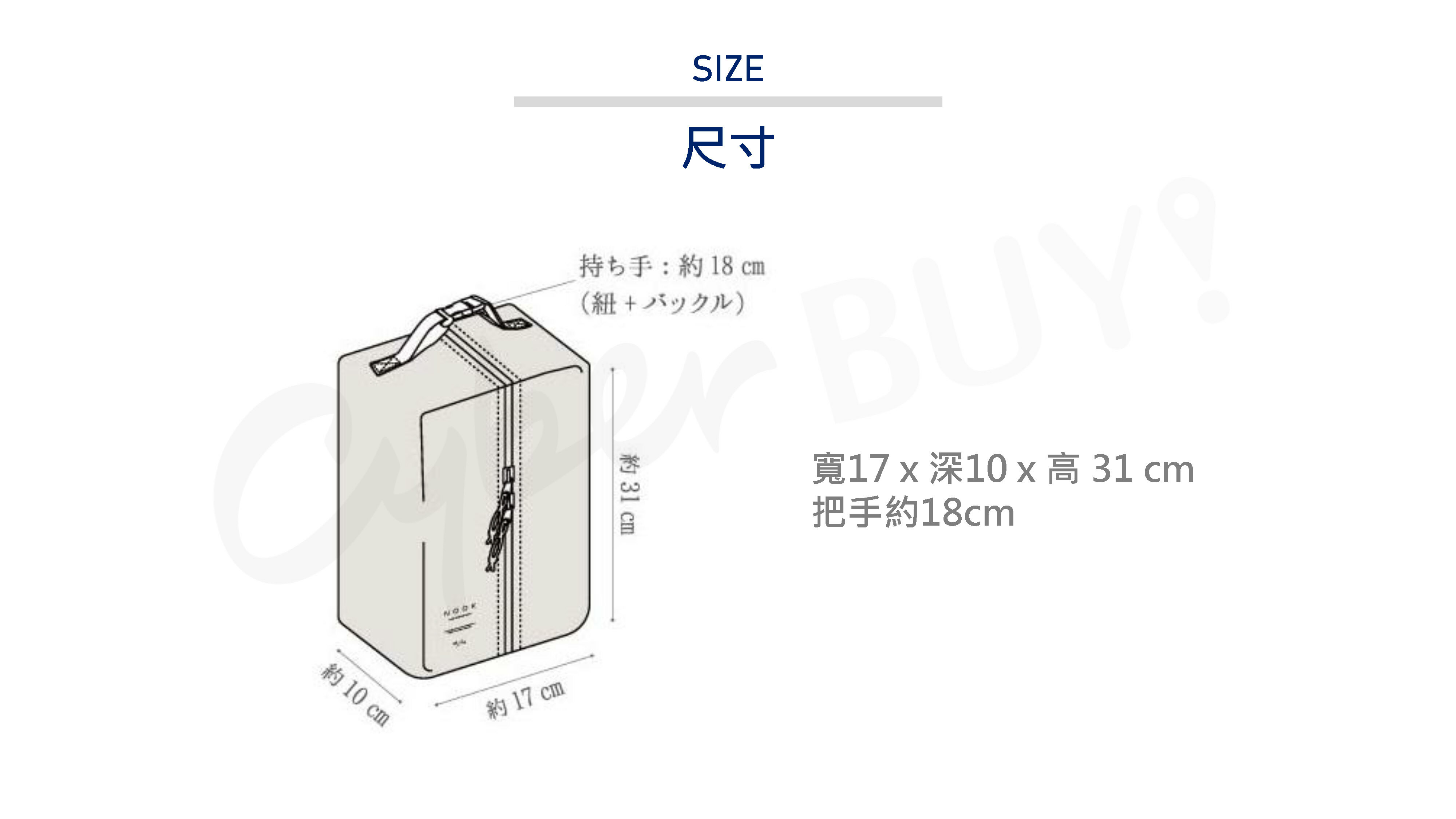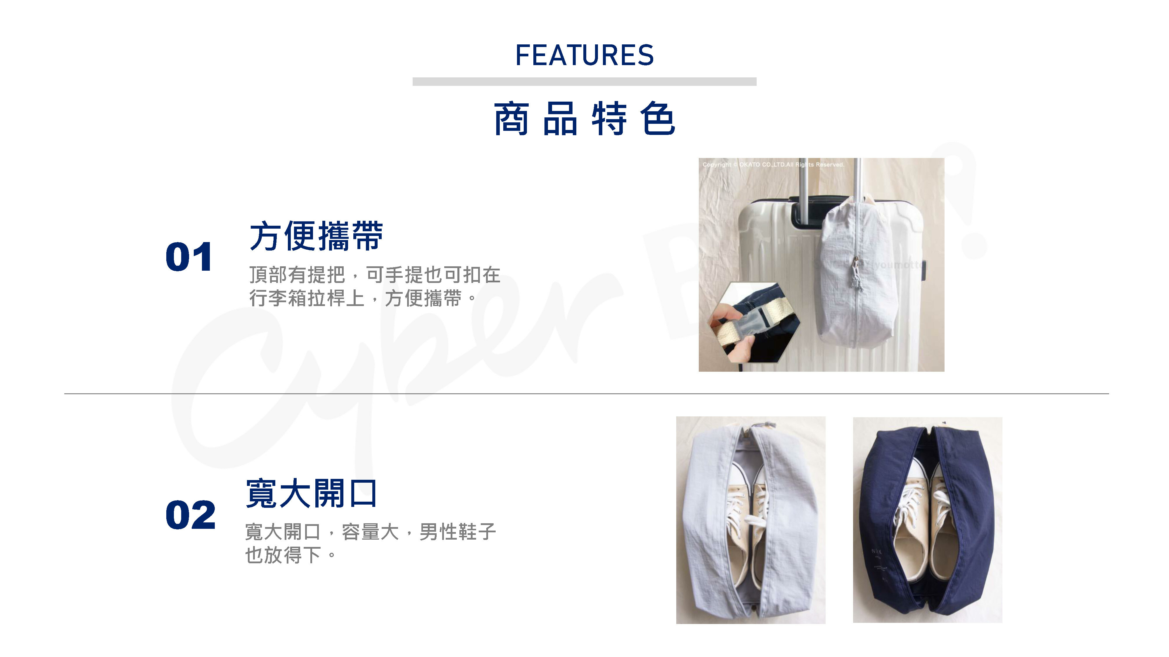 ●鞋子收納袋頂部有提把,可手提也可扣在行李箱拉桿,方便攜帶
