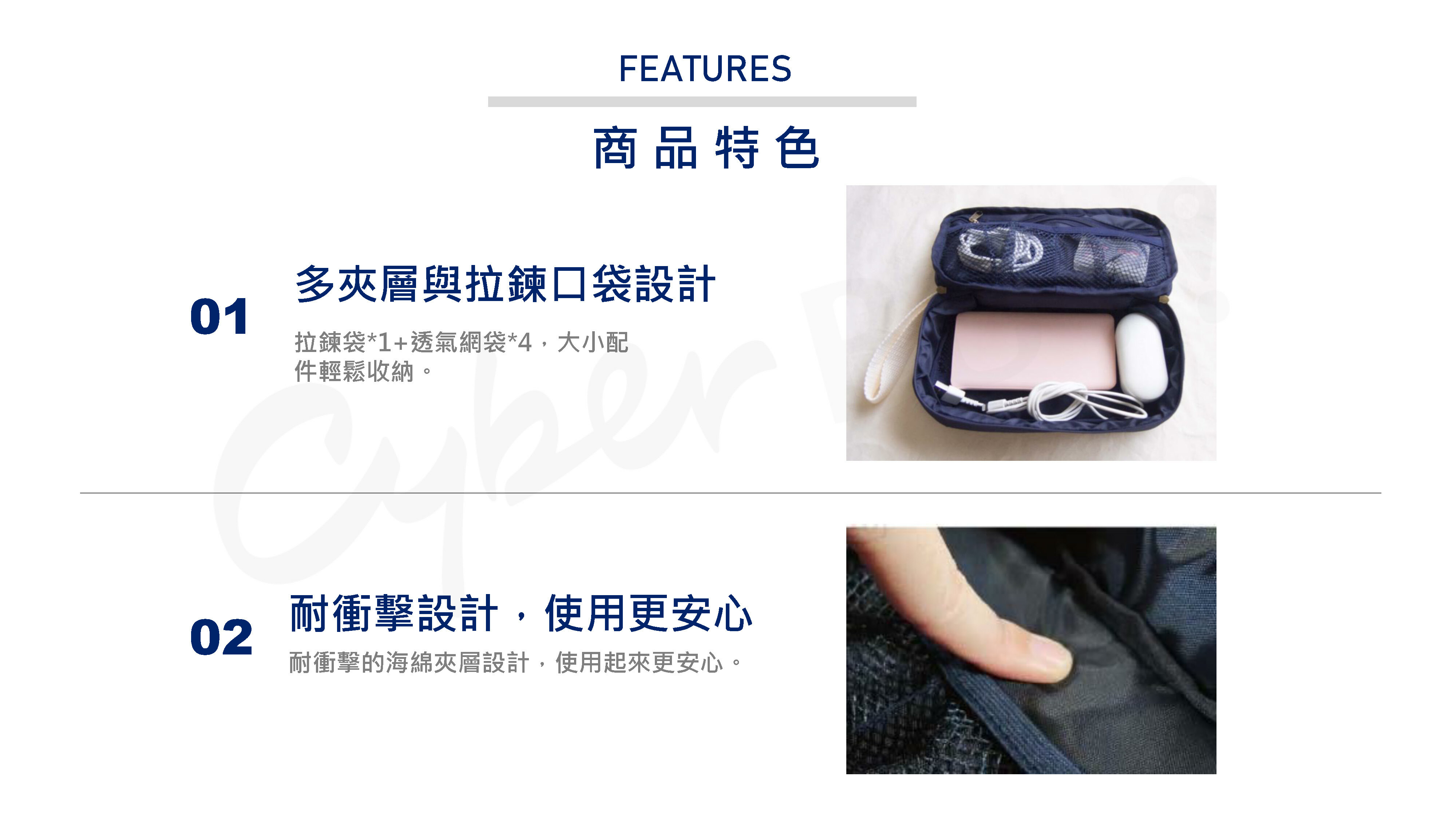 ●3C收納包多夾層與拉鍊口袋設計,讓眾多線材配件輕鬆收納