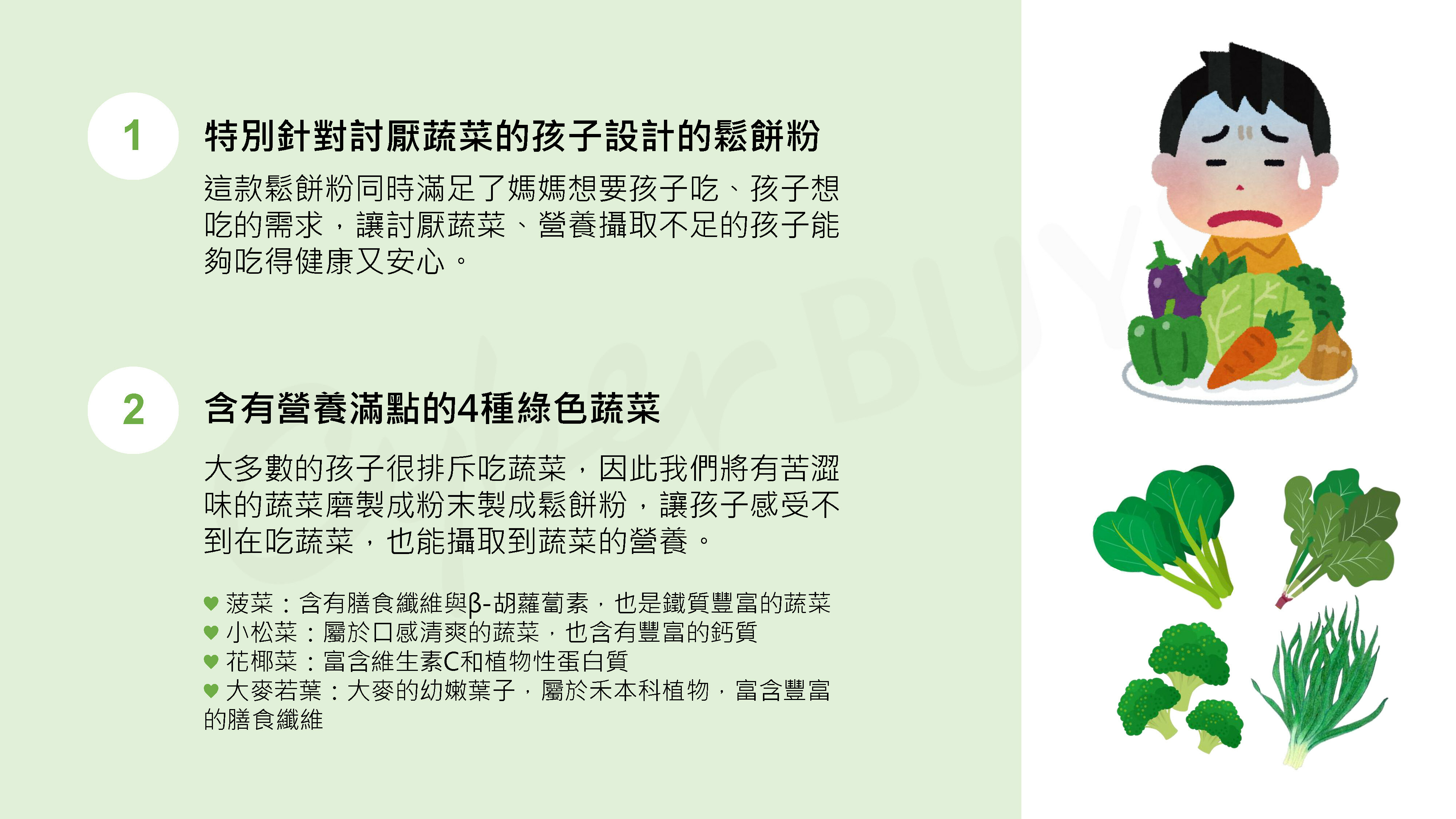 ●含有4種綠色蔬菜,讓挑食孩子能自然地攝取蔬菜營養