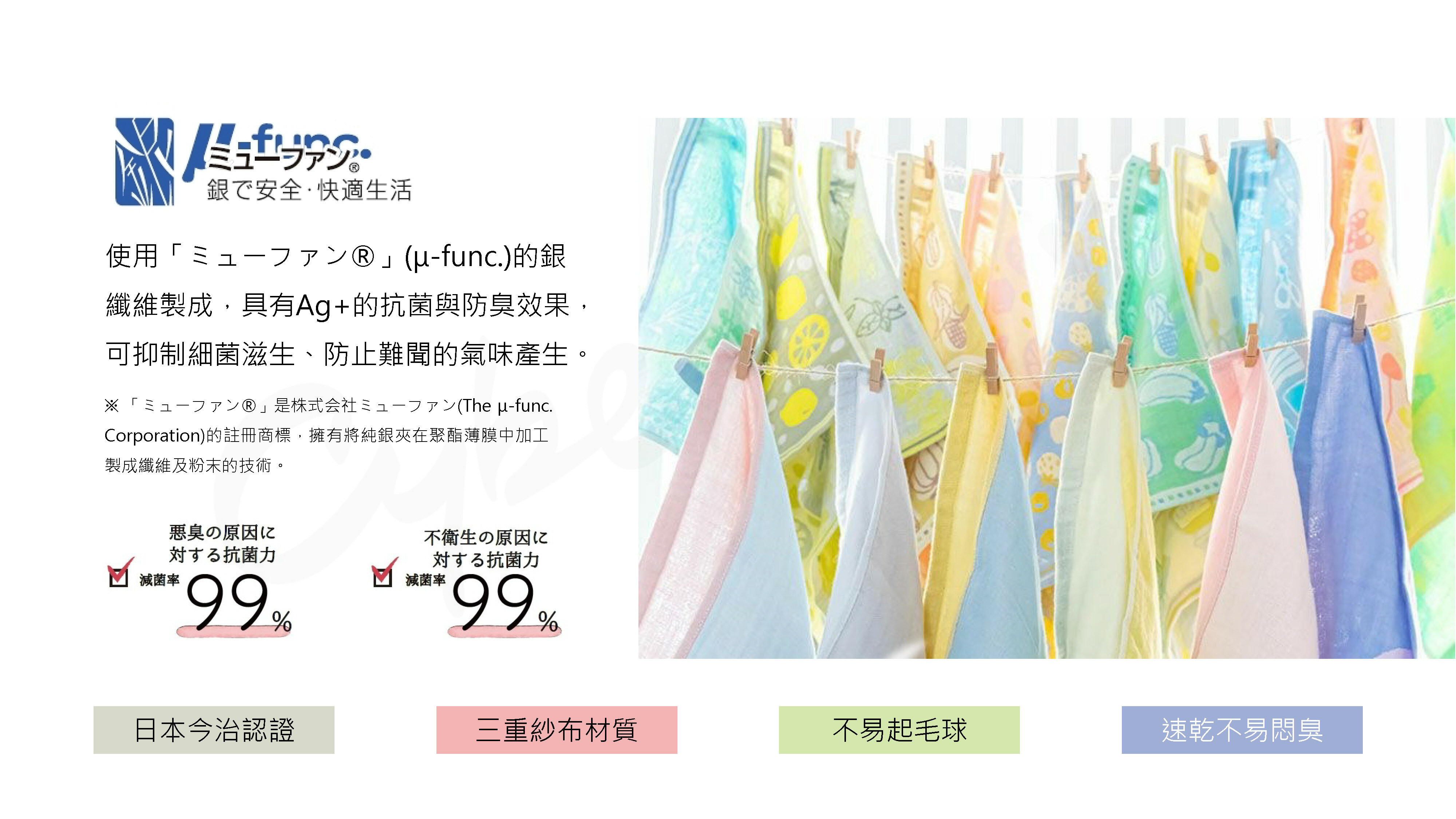 ●系列產品使用「 ミューファン ® 」μ func的銀纖維製成,具有Ag+的抗菌與防臭效果
