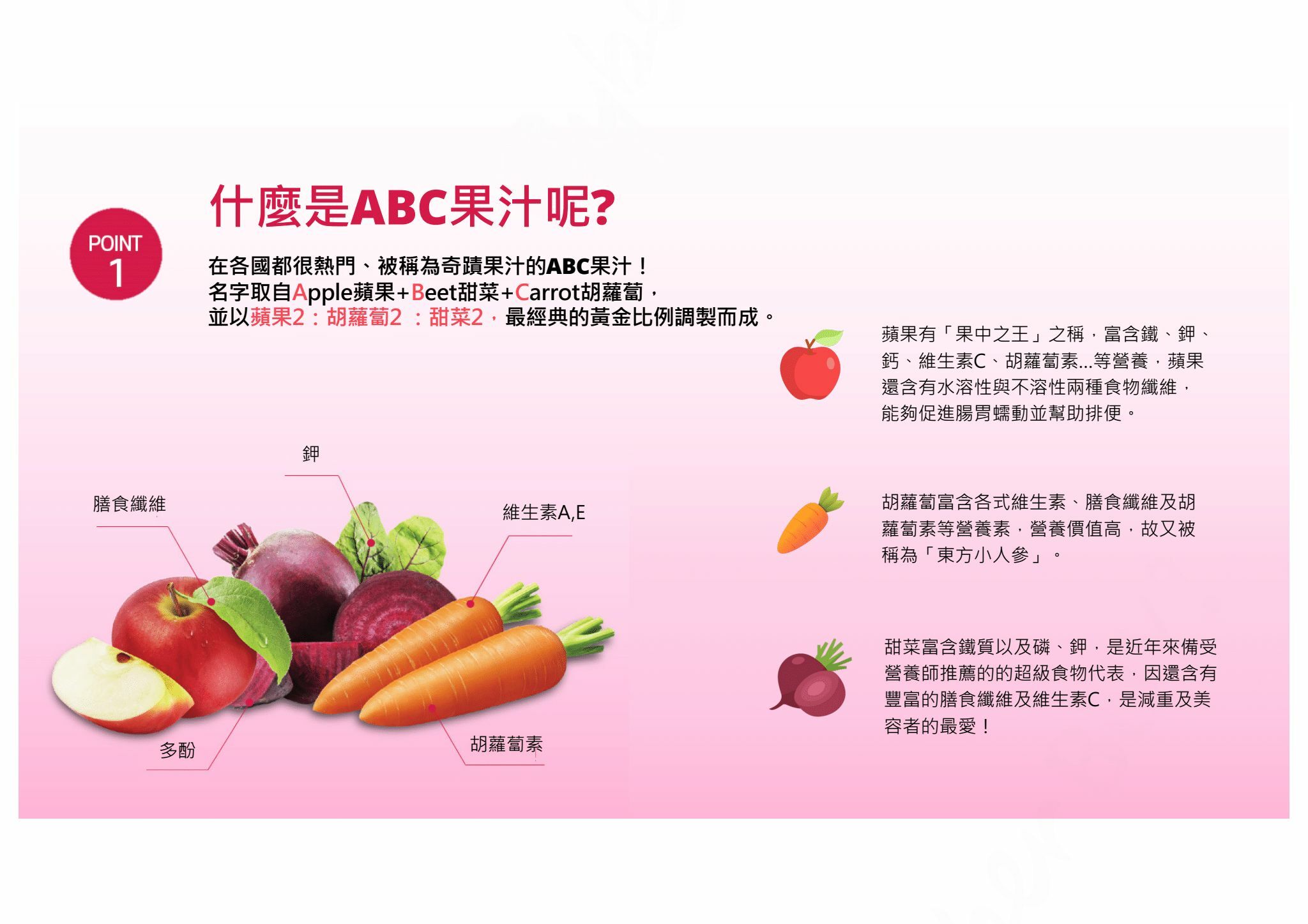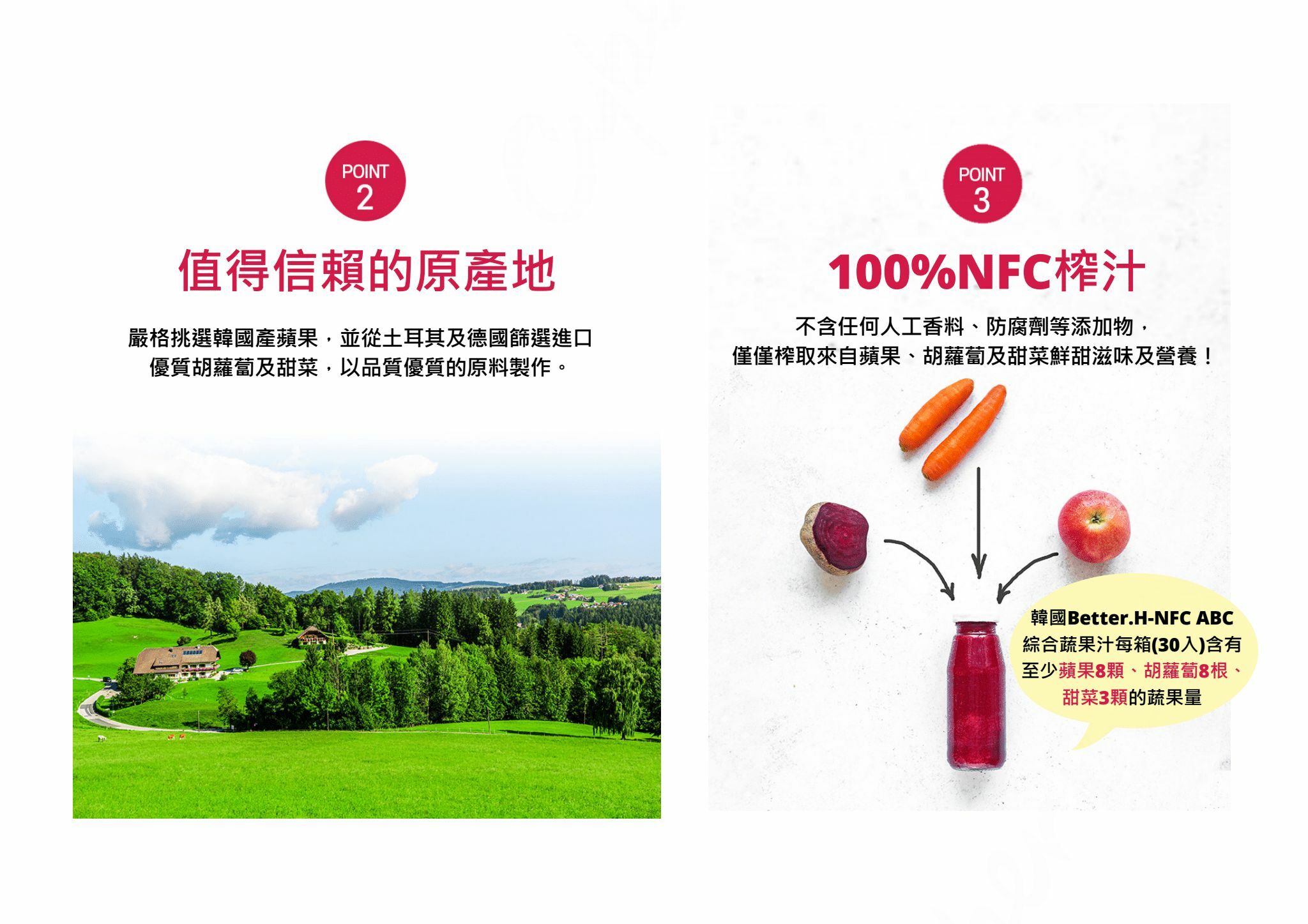 ●將蘋果、胡蘿蔔及甜菜以完美比例調配壓榨製成,非濃縮還原