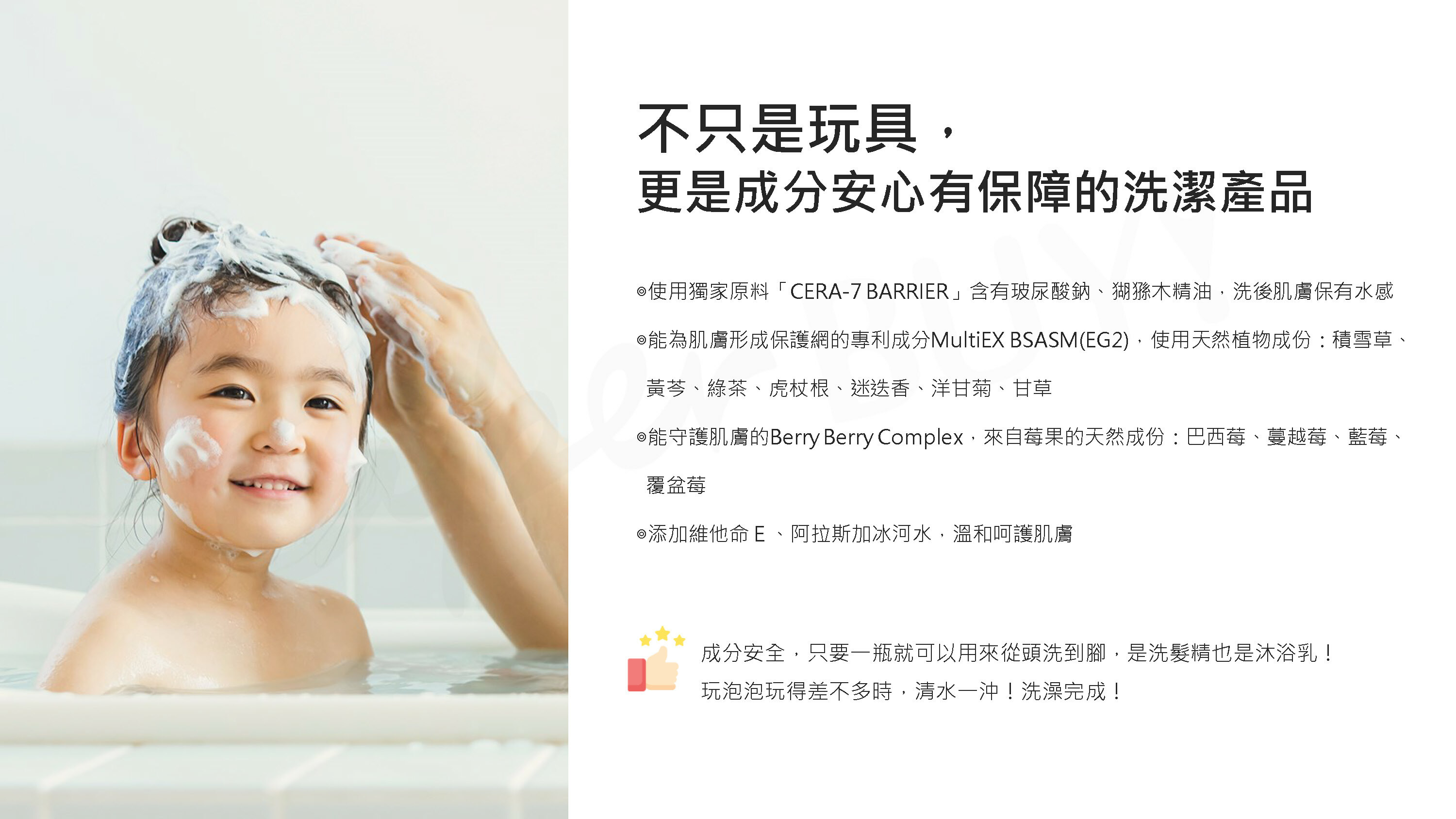 選用天然原料製作,讓孩子們能夠安全且盡情享受歡樂的沐浴時光。
