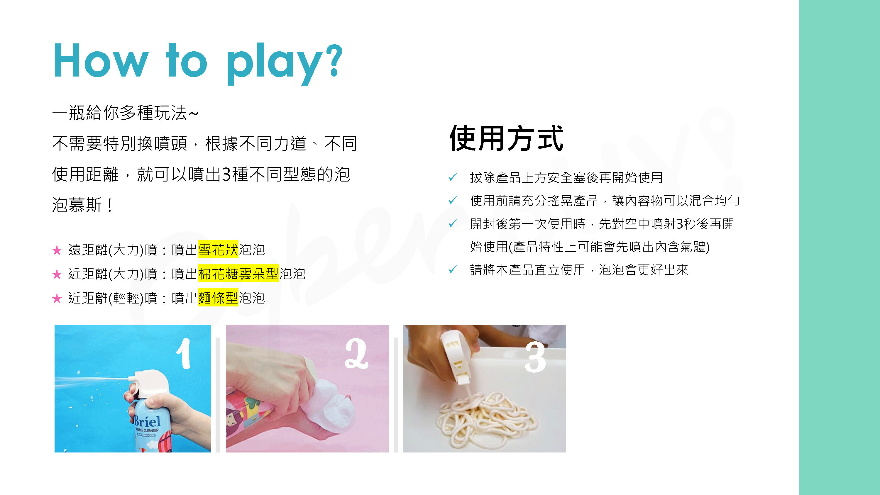 ●一瓶多種玩法,依據不同力道、距離可噴出不同型態泡沫